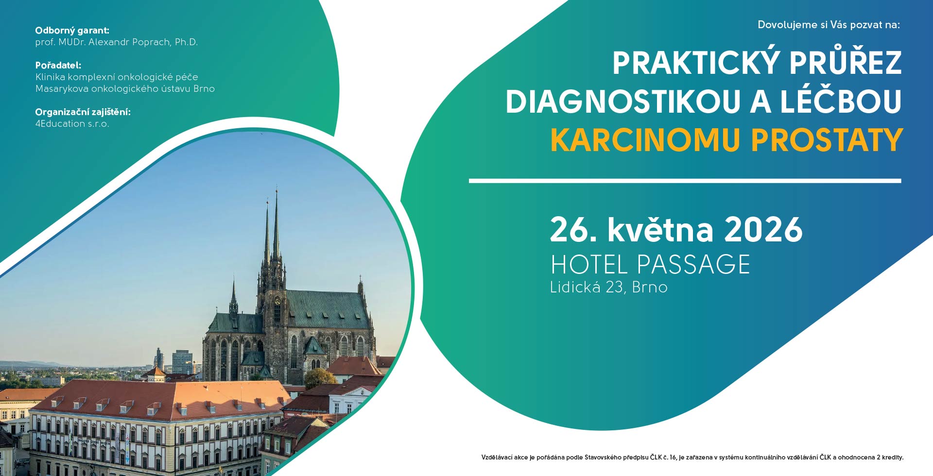 Zaškrtnutím tohoto pole vyjadřujete svobodný a vědomý souhlas pořadateli akce „Praktický průřez diagnostikou a léčbou karcinomu prostaty, 26. 05. 2026, Brno“, kterým je společnost 4Education s.r.o., se shromažďováním, zpracováním a uchováním svých osobních údajů v rozsahu zadaném ve formuláři. Ochrana osobních údajů odpovídá zákonu č. 101/2000 Sb. a požadavkům nařízení EU 2016/679 (GDPR).